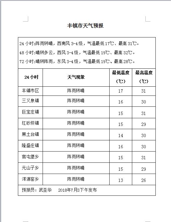 丰镇市天气预报
